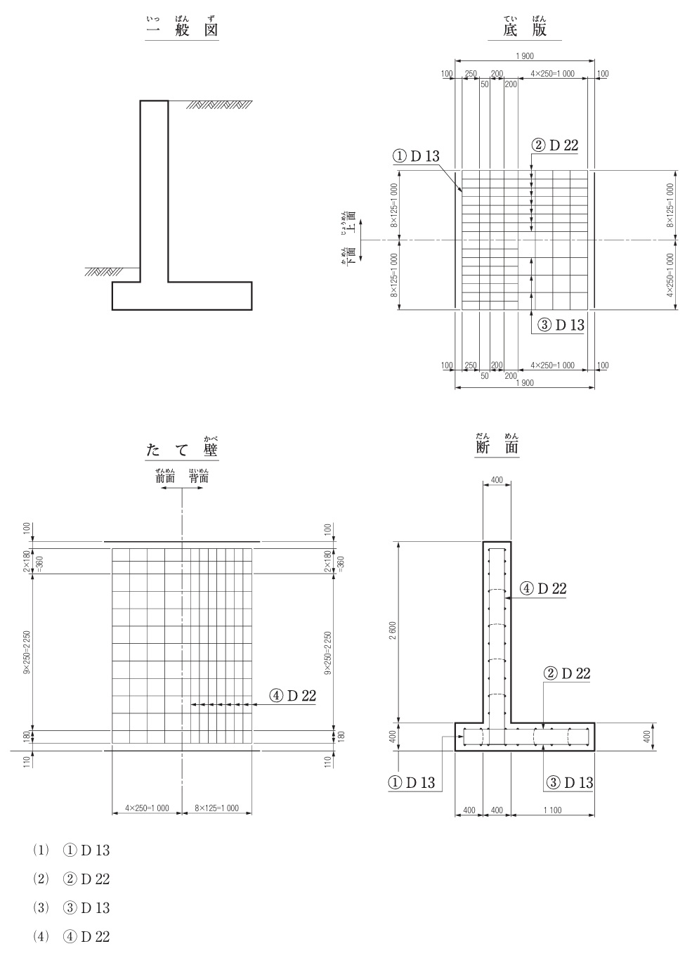下図は,逆T型型擁壁の配筋図を示したものである。