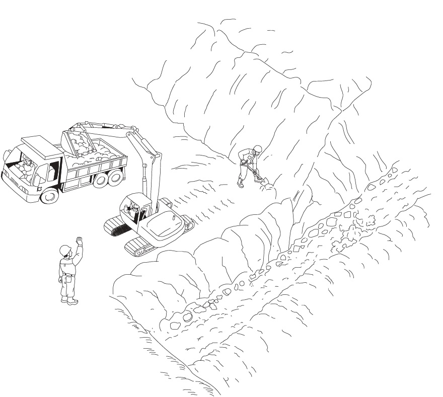 建設現場における,車両系機械による掘削又は積込み作業中の労働災害とその防止対策について,労働安全衛生規則に定められている,事業者が実施すべき事項を5つ解答欄に記述しなさい。