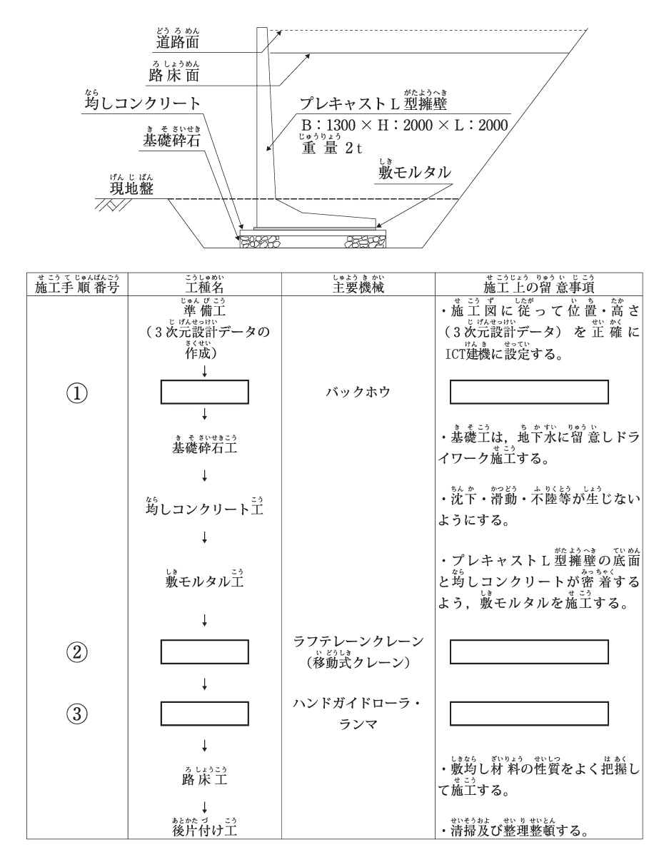 下図のようなプレキャストL型擁壁を設置し路床面まで施工する場合の施工手順が次の表に示されているが,施工手順番号①〜③のうちから2つ選び,それぞれの番号と該当する工種名及び施工上の留意事項を解答欄に記述しなさい。