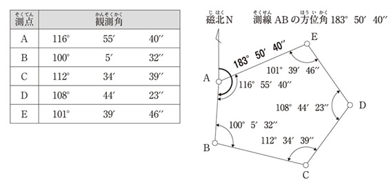 測線 AB の方位角は183° 50'40" である。測線 BCの方位角は次のうちどれか。