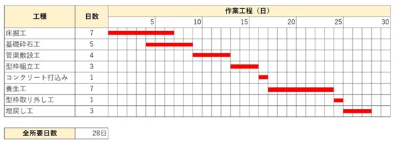 ・床掘工7日・基礎砕石工5日・養生工7日・埋戻し工3日・型枠組立工3日