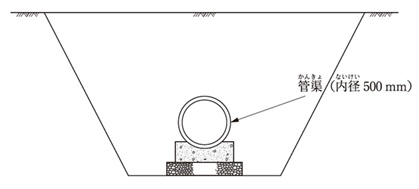 下図のような管渠を構築する場合,施工手順に基づき工種名を記述し, 横線式工程表(バーチャート)を作成し, 全所要日数を求め解答欄に記述しなさい。