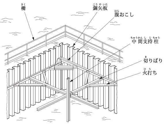 下図に示す土止め支保工の組立作業にあたり,労働安全衛生規則で定められている事業者が実施すべき,安全管理上必要な労働災害防止対策について2つ解答欄に記述しなさい。